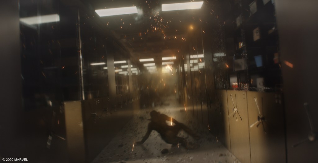 While Digital Domain worked out how the scenes would progress, so many different elements were introduced that it was a jumble of smoke, half destroyed jets, and pieces of building. One particular window panel is used to stage a confrontation [see imagery] between the Black Widow and the Taskmaster. The DD artists massaged every shot manually, rendering several iterations to assist creative decisions. They turned to GPU rendering, along with Maxon’s GPU-accelerated renderer, Redshift.