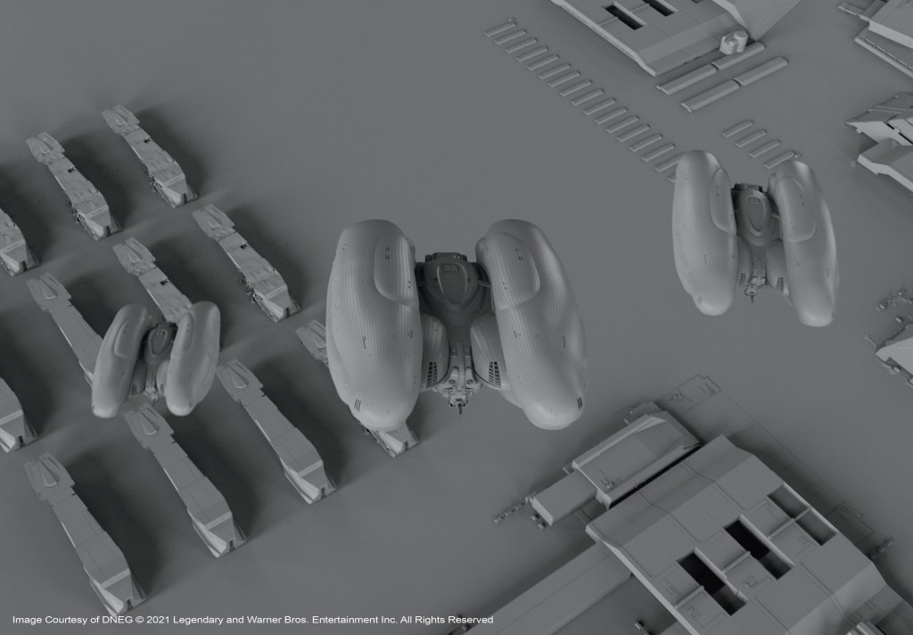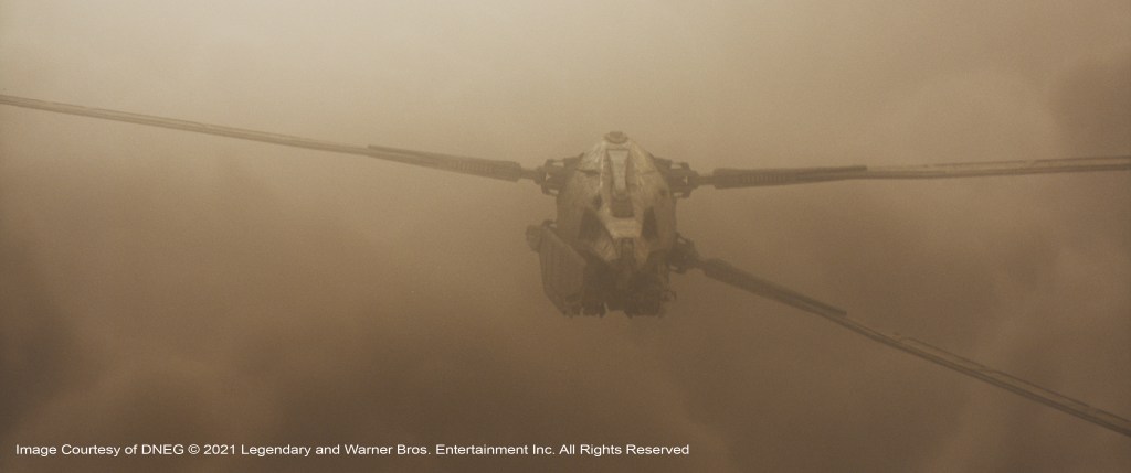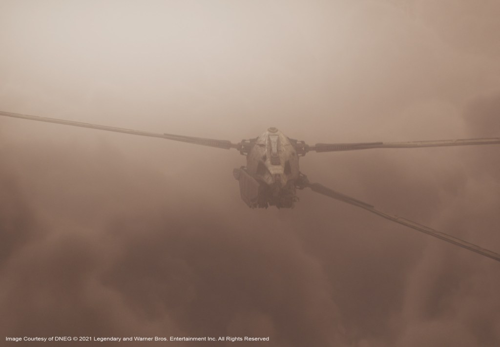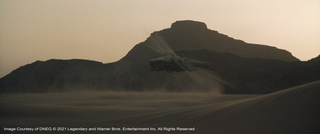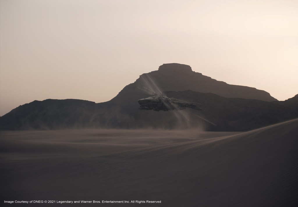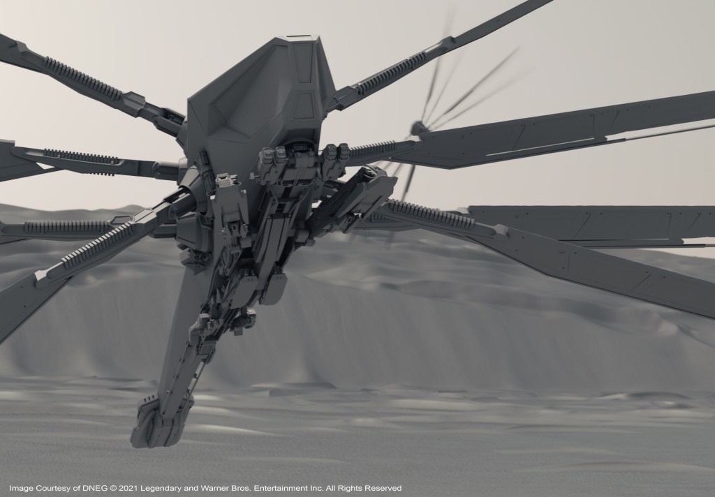 DNEG created the vast Arrakeen Space Port including a monolithic control tower. There were Atreides spaceships, Spice Harvesters and Ornithopters. The Space Port was suitably populated to support the pomp and circumstance of the House Atreides arrival. The team was also responsible for crafting huge sections of the Arrakis desert planet environment.