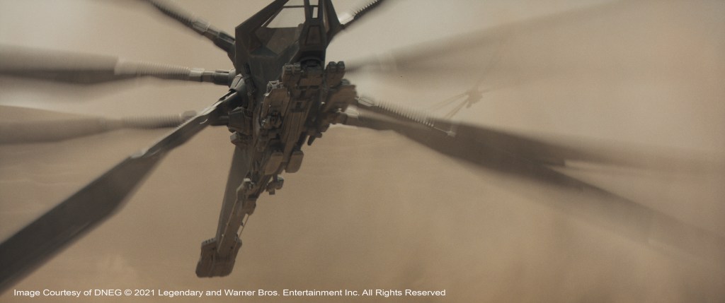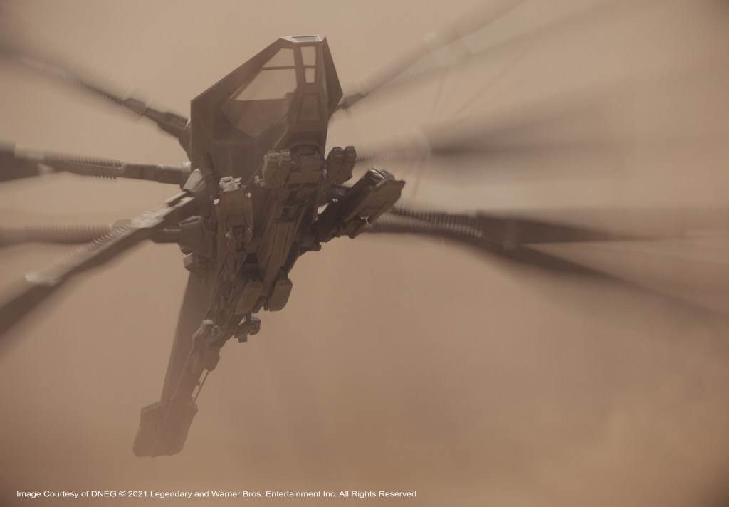 The Ornithopters were built in CG but built in VFX upon the bodies of practical helicopters. But the production had two 12-tonne Ornithopters made, and these were both shipped out to Budapest and to Jordan, in order to be used as photographic reference, background and to allow landing and take-off shots to be based on practical downwash. They were huge, and at times used as interior sets, as the Sandscreens and dunes of sand were handy just outside the window.