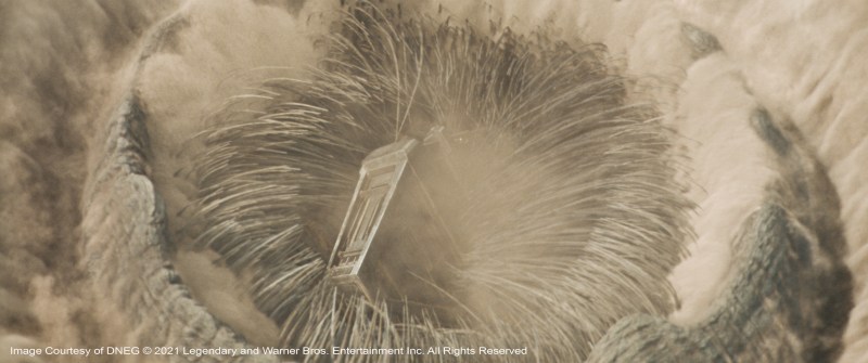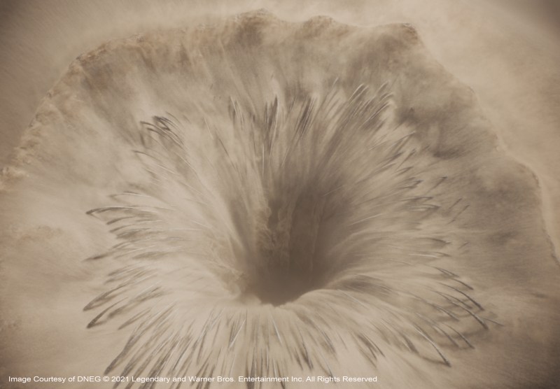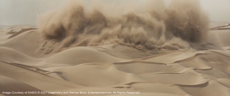 The arid desert climate set the stage for the creation of huge sandstorms, replicating real arid weather. These simulations were meticulously detailed and created to illustrate the large scale and power these storms produce on the planet. Huge FX simulations were created for the Sand Worms were shifted around as they traversed the desert dunes, both under and over. A special technique had to be developed to bolster these simulations to have even more fine sand cascading off the worms and surrounding sand dunes.
