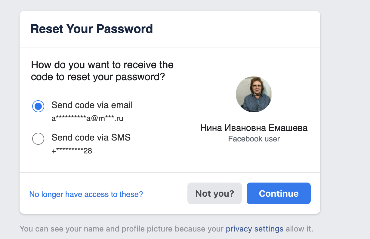 Then one fine day I opened up Facebook in my home office and was met with a confusing dialog box. ‘Your account has been disabled’. I was quite busy that morning and went on with my other work. When I opened up later that month, there was even less for me to see. I could not raise my account at all. I was met with, ‘We can’t review this decision because too much time has elapsed since your account was disabled.’ At one point I found a way for Facebook to ask for identification and it took me to a page where it would show what it had on my account. There staring across at me was a photo of a middle-aged woman and an asterisked email address from Russia (see below). Does that mean the account had been hacked? I couldn’t be sure.